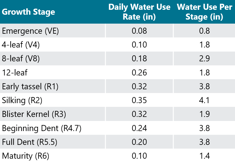 Table 1. Average daily corn water use, water use per growth stage, and cumulative water use over the course of the growing season.